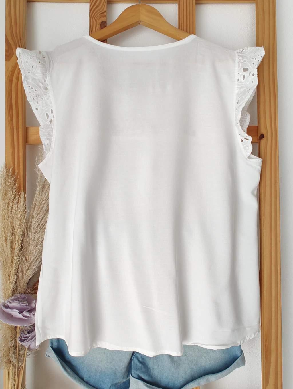 Remera confeccionada en fibrana con volados en hombros de broderi.