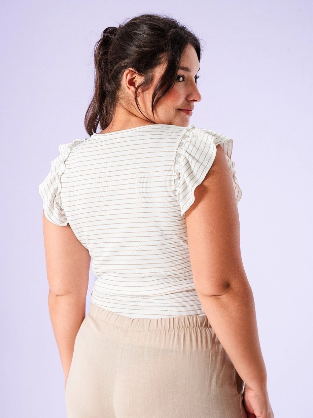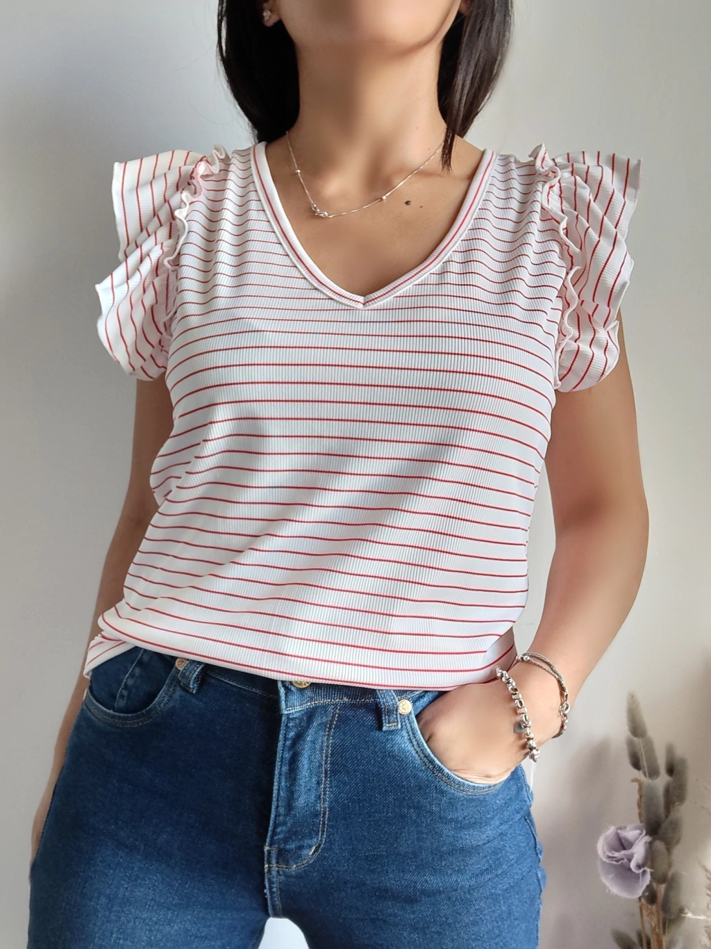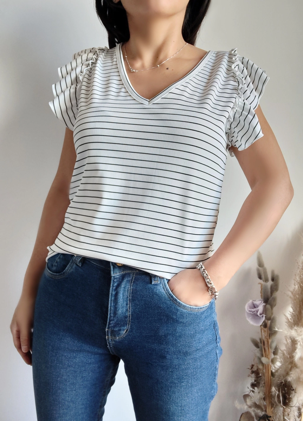 Musculosa realizada en microfibra con textura morley. Detalle de volado en hombros.