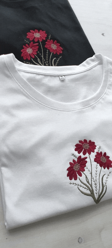 Realizada en algodón premium con cuello reforzado. Flor bordada.