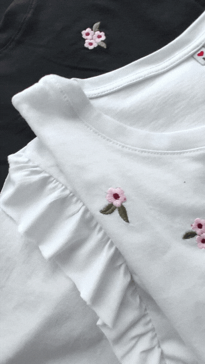 Flores bordadas, detalle de voladito en el hombro.
