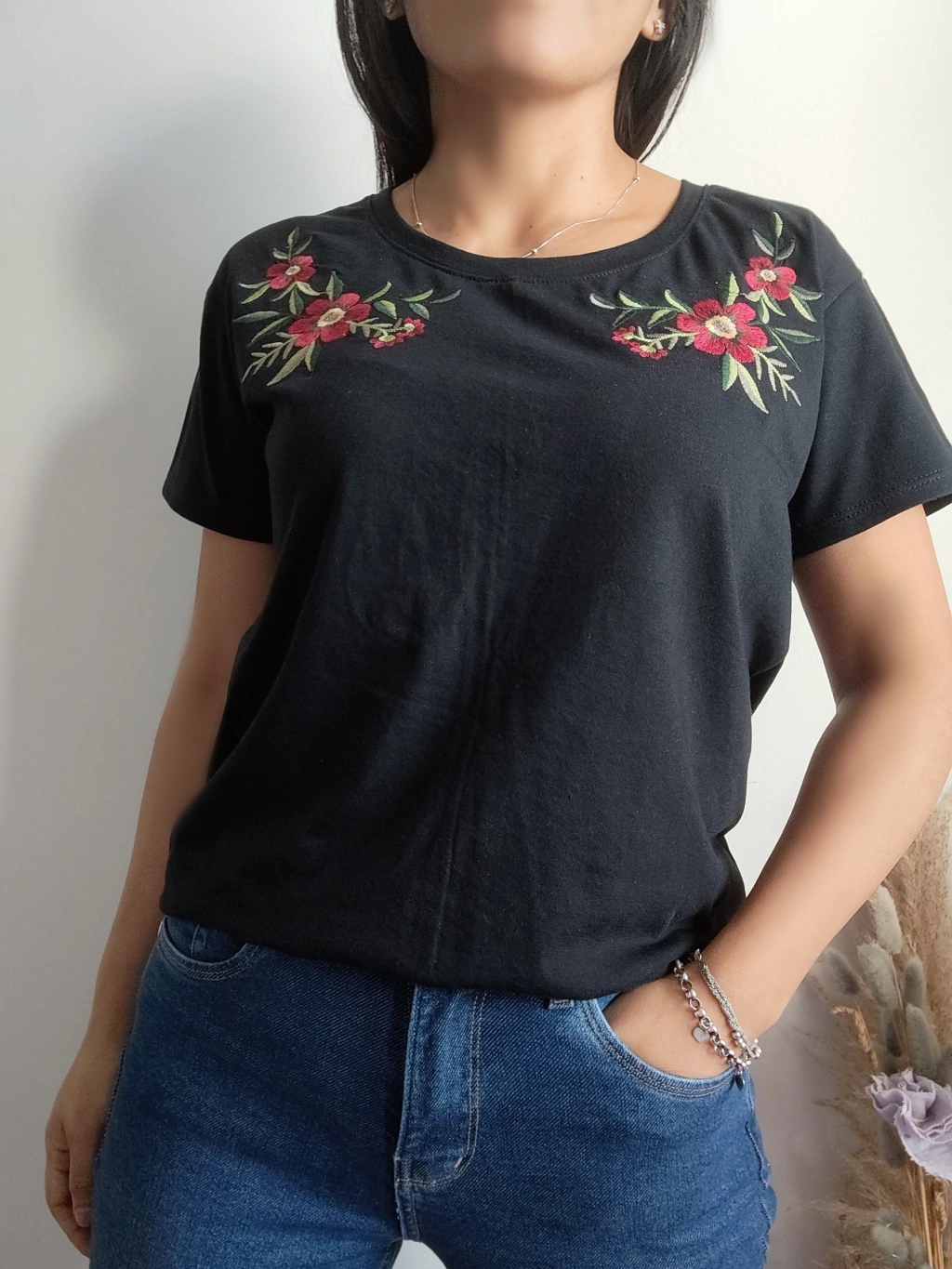 Remera de algodón peinado con flores bordadas. La remera tiene dos cortes en los laterales de 9cm.