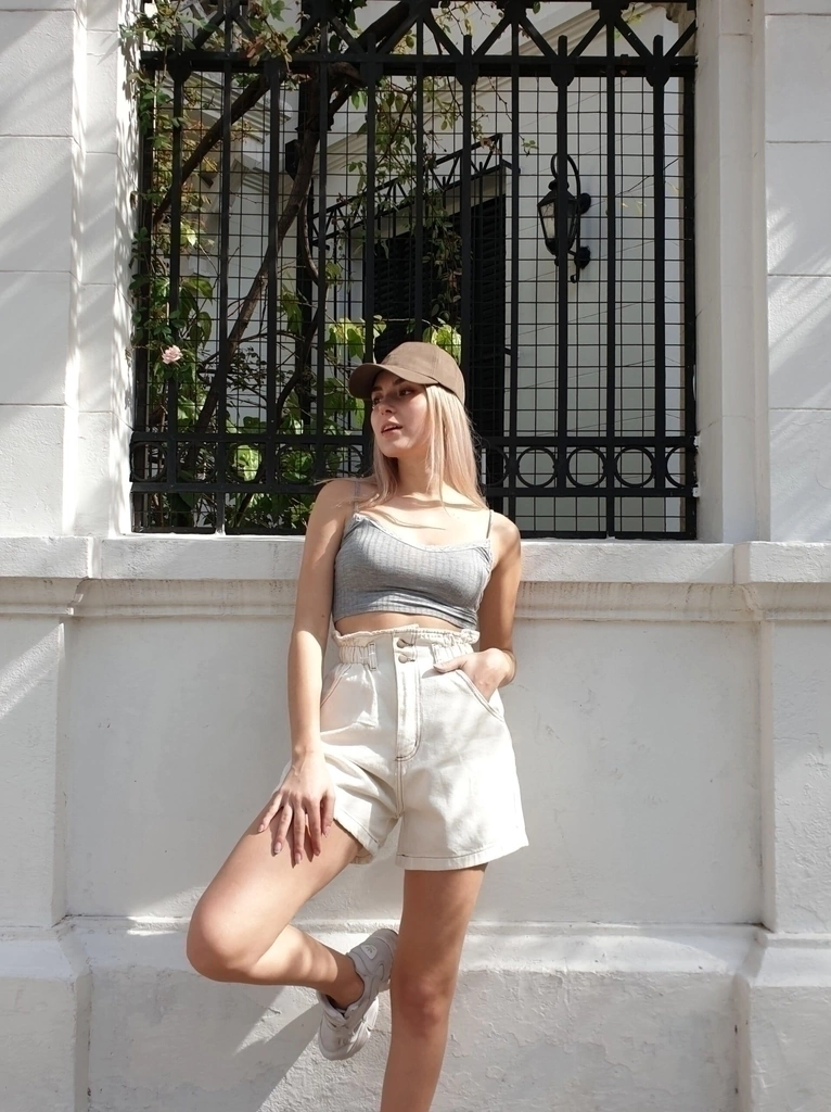 Short crema rígido con botones color cobre hilo marrón. La tela no elastiza pero es muy flexible y liviana.